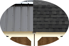 Give your shed & backyard landscape an upgraded look with our 29-gauge metal roof, available in a wide array of colors and backed by a 30-year limited warranty.OR…match your home’s roof for looks or for HOA compliance using our residential grade architectural shingles, available in commonly used colors.