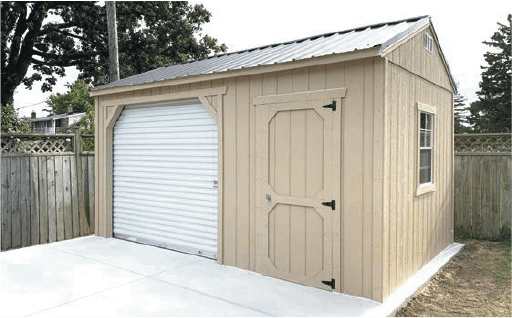 Shelter large lawn equipment and similar large equipment, or for use as a workshop. However, please be advised IBC (International Building Code) dictates that our Garage Package sheds are not intended for use as a private garage to store motor vehicles because they do not have a non-combustible floor. You may also want to consider additional flooring thickness upgrades to increase the total load and point load limits if you plan to store larger and heavier items like riding lawnmowers.