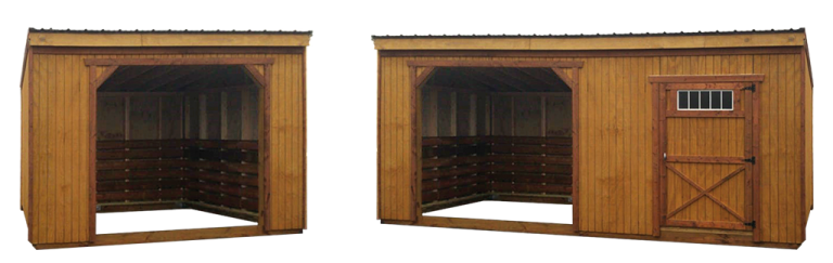 Single Slope Animal Shelters have a front wall height that reaches a minimum of 100″ and rear wall height of 84″. Designed with a roof slope, these buildings come standard with a 3/12 roof pitch to maximize space. Our Single Slope Animal Shelters are Engineer Certified and have a 4x6in pressure treated perimeter base to resist rotting. Upgrade your building by adding stalls, partitions, or a tack room, depending on the size.