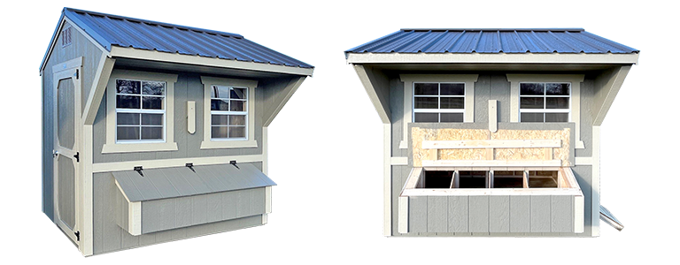 It includes a 3ft barn door on the end, two 24in x 27in single pane windows to allow in fresh air, a roosting ladder, raised nesting boxes with an exterior hatch access, and a small chicken door that will allow the chickens to exit the coop to range in the area of your choosing. Chicken Coops are available in 6ft or 8ft widths and in a few different lengths.