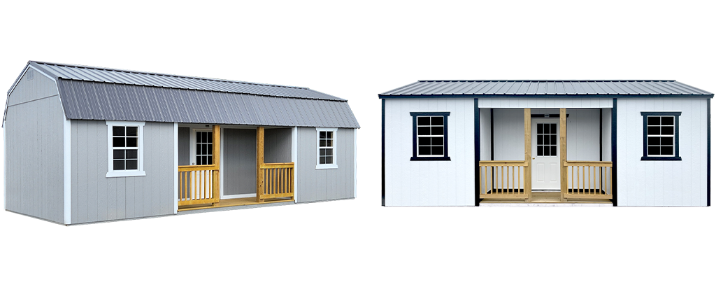 The Utility Center Porch option features 8′ walls. Minimum building size is 12′ x 24′. Image shown includes additional options that may not be part of the standard package. This package is not available with Vertical Metal siding.