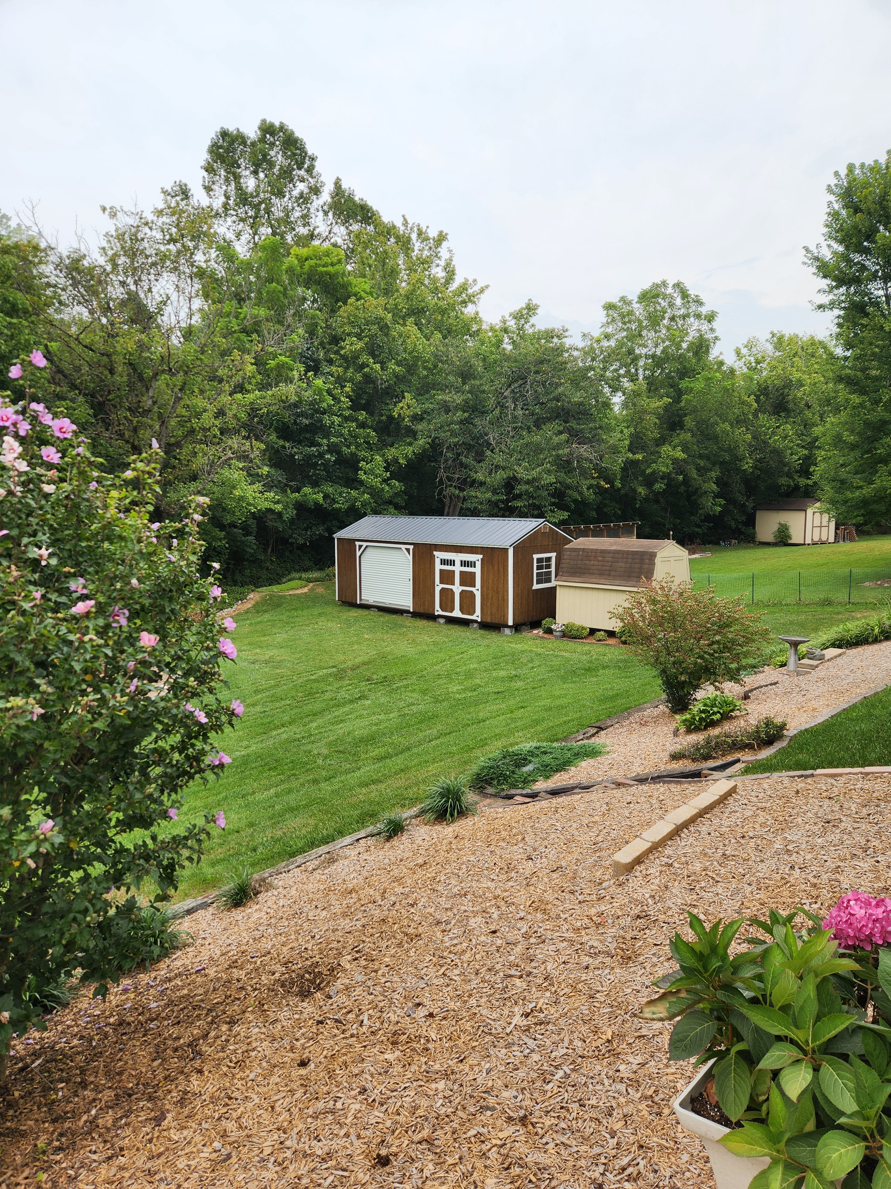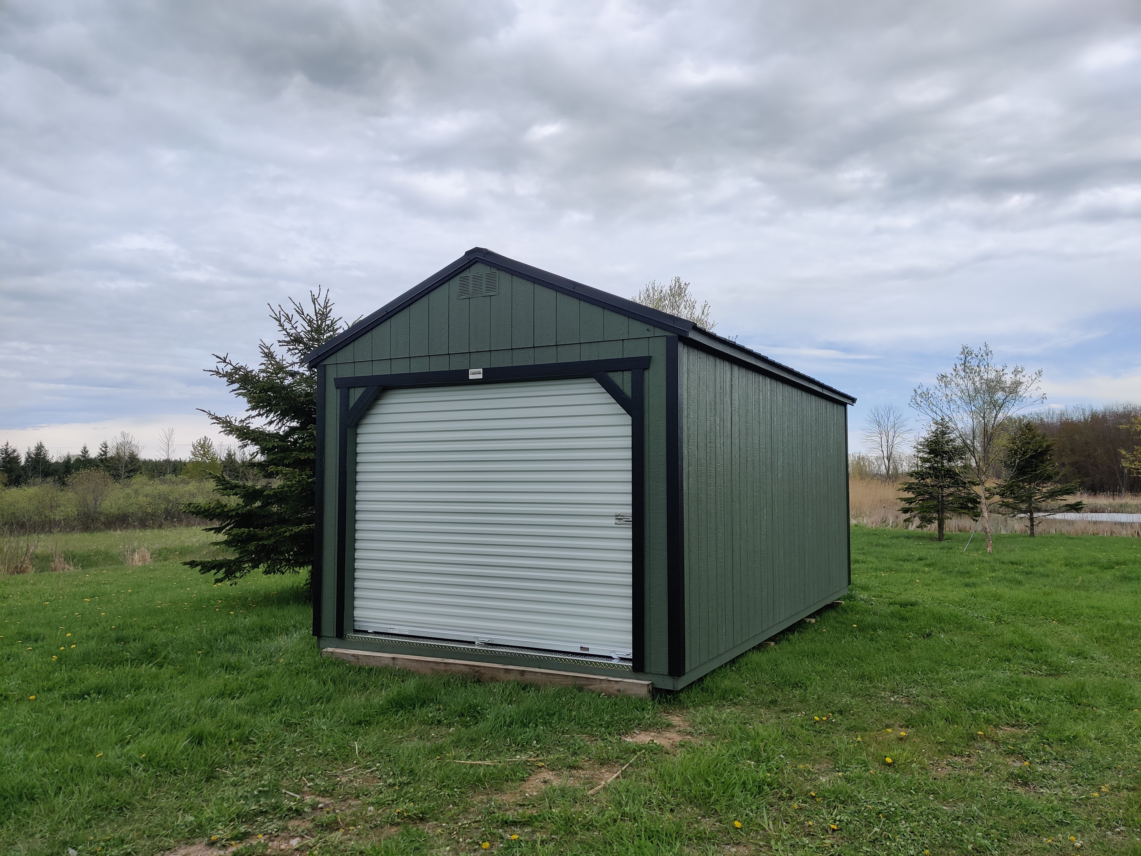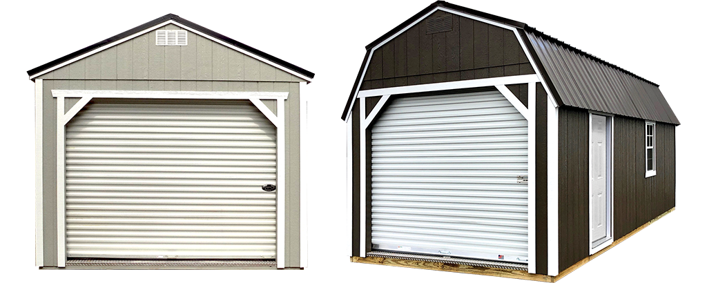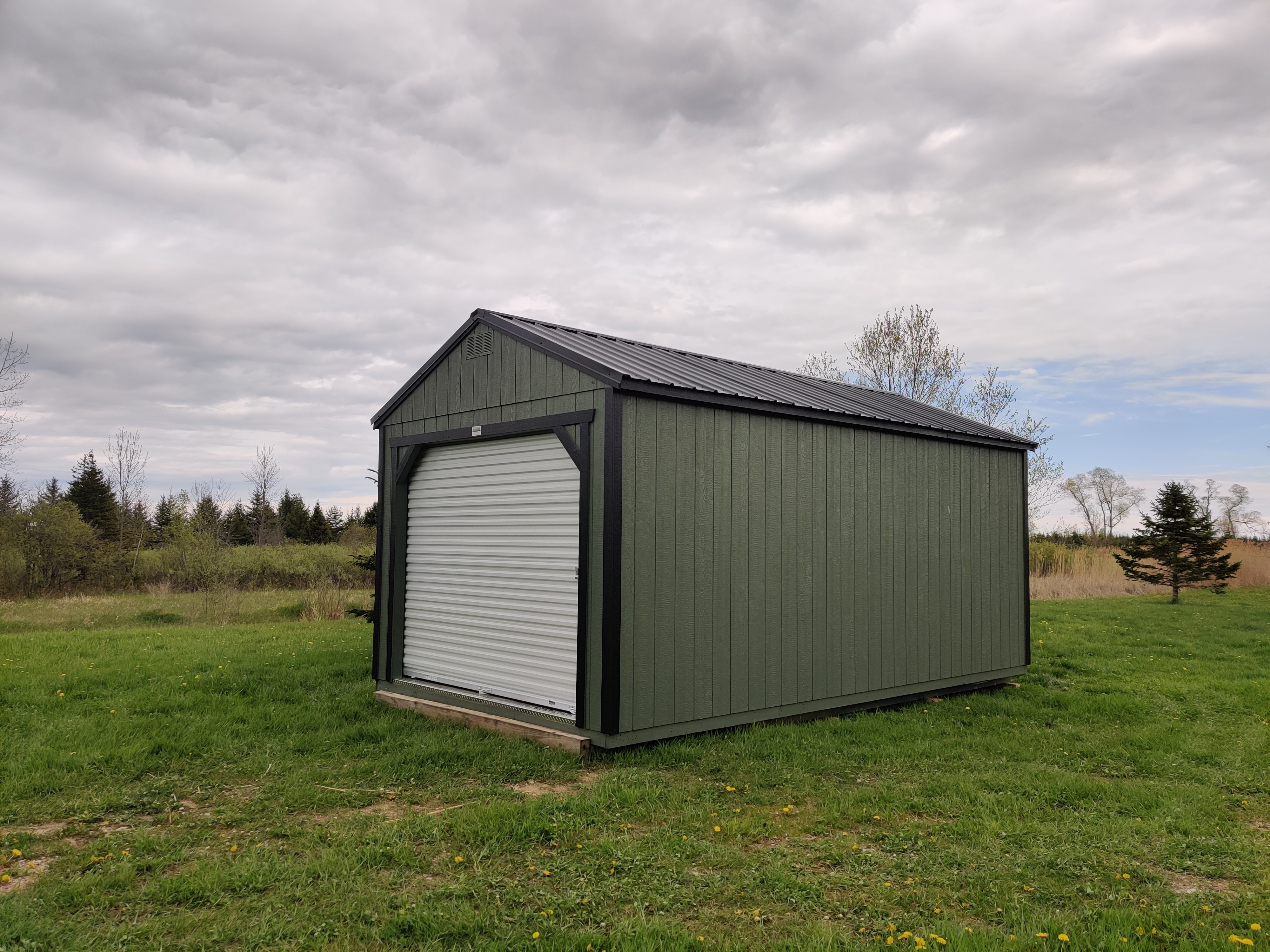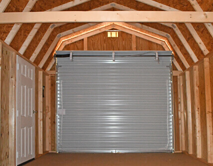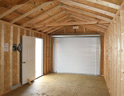 A roll-up garage door is ideal for easy-access storage, especially for larger items that need a wide lockable opening. The package also includes a solid walk-in door, one 2x3ft single-pane window, 12in On-Center floor joists, and a diamond plate door threshold. The Utility version includes 8ft walls.