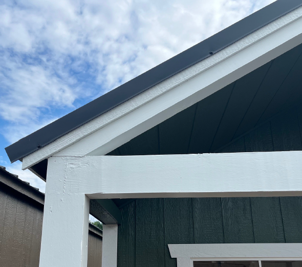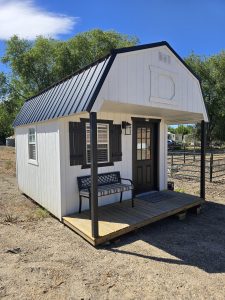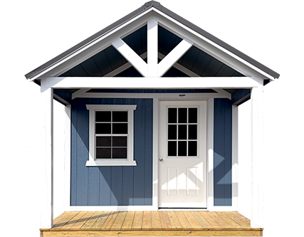 The Playhouse package is an easy add-on if you’re looking to give your barn or shed some country style and a place to sit in the shade. It includes a 9-lite walk-in door, 4ft of porch, two porch posts, and three 2x3ft single-pane windows. The Utility version includes 8ft walls. As an upgrade to the Utility Shed with Playhouse Package, the Vaulted Gable utilizes painted wood posts, beams and a crow’s foot architectural detail to create a full height open front porch.