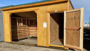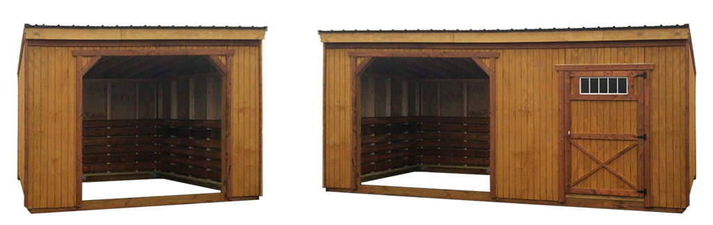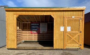 Single Slope Animal Shelters have a front wall height that reaches a minimum of 100″ and rear wall height of 84″. Designed with a roof slope, these buildings come standard with a 3/12 roof pitch to maximize space. Our Single Slope Animal Shelters are Engineer Certified and have a 4x6in pressure treated perimeter base to resist rotting. Upgrade your building by adding stalls, partitions, or a tack room, depending on the size.