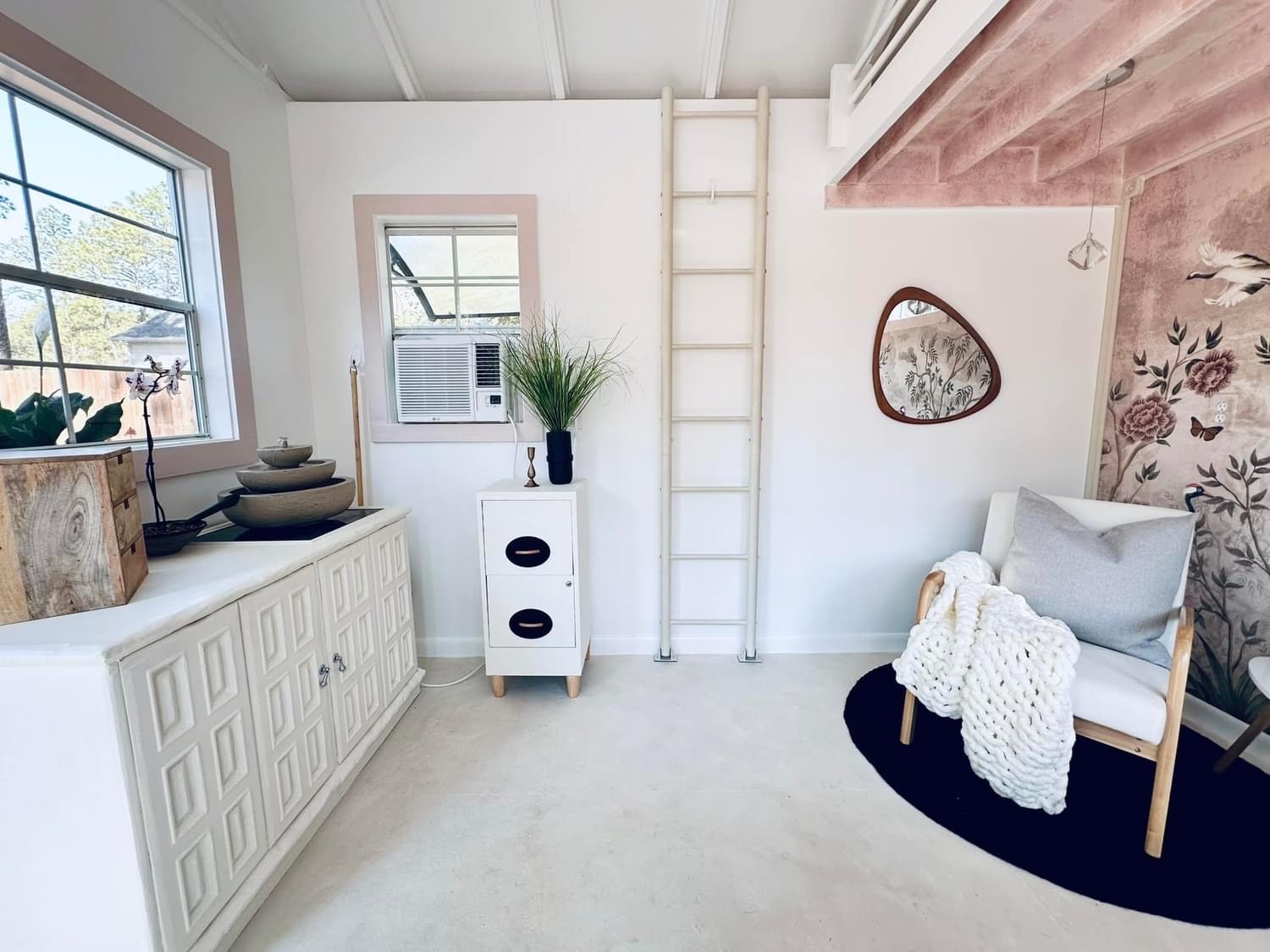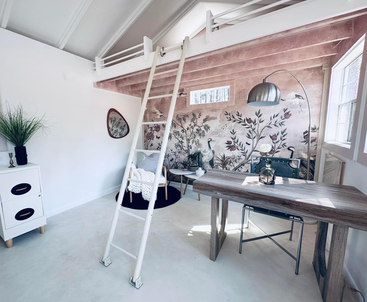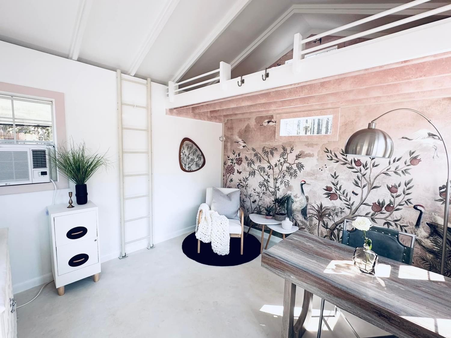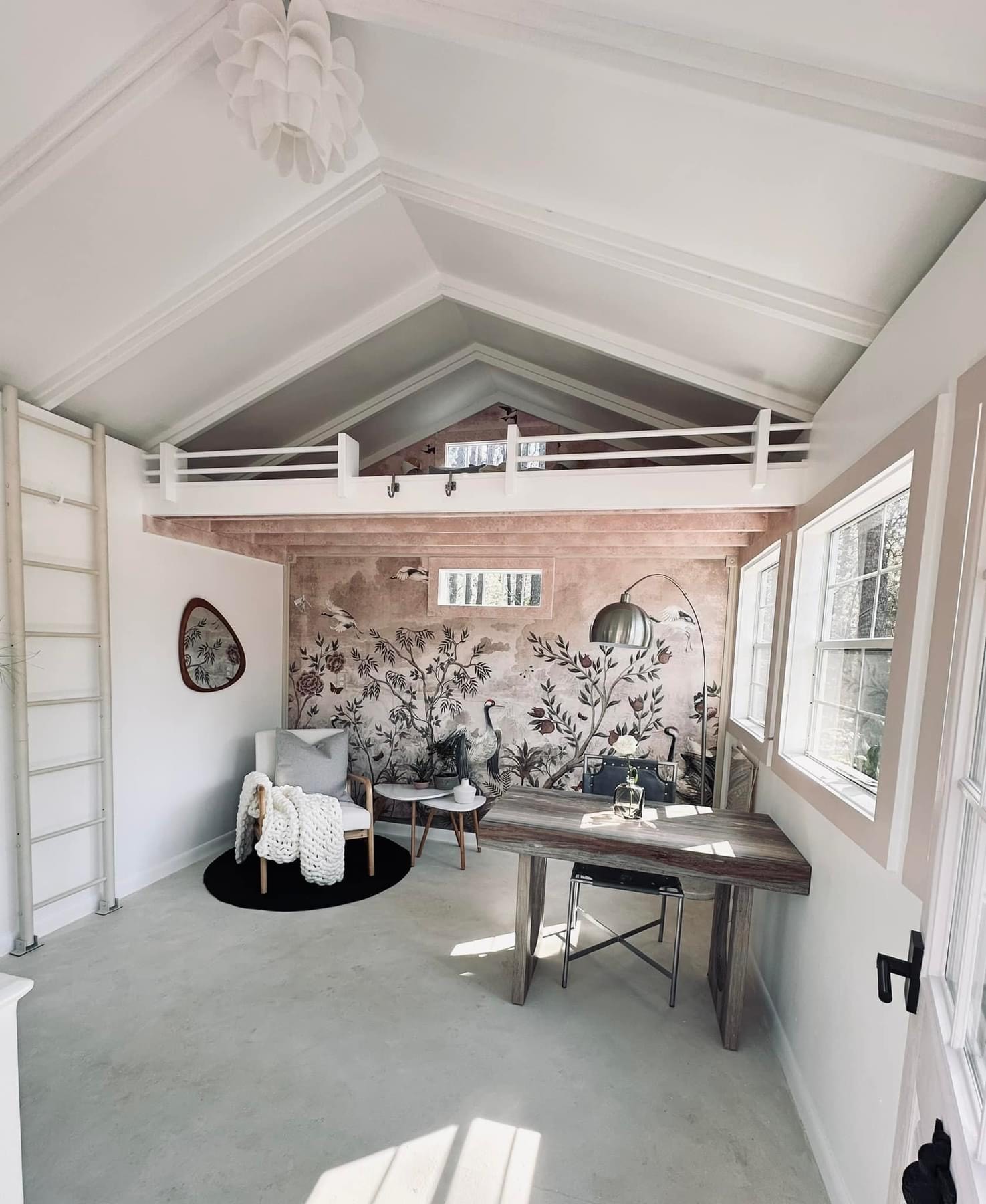I designed my 12×12 shed with many windows so I could work in natural light. My first task was to wire for electricity, then add insulation and drywall. Next, I hung a Japanese mural that would be the centerpiece for my Japandi-style interior. This feature, coupled with the intentional high loft, minimal furniture, and neutral tones, opened up the space to make it look and feel much larger than it is. Last was the floor. Resin can be messy, so I opted to keep the floor as is and painted a lime wash over it, which created a beautiful finishing touch to the room.”