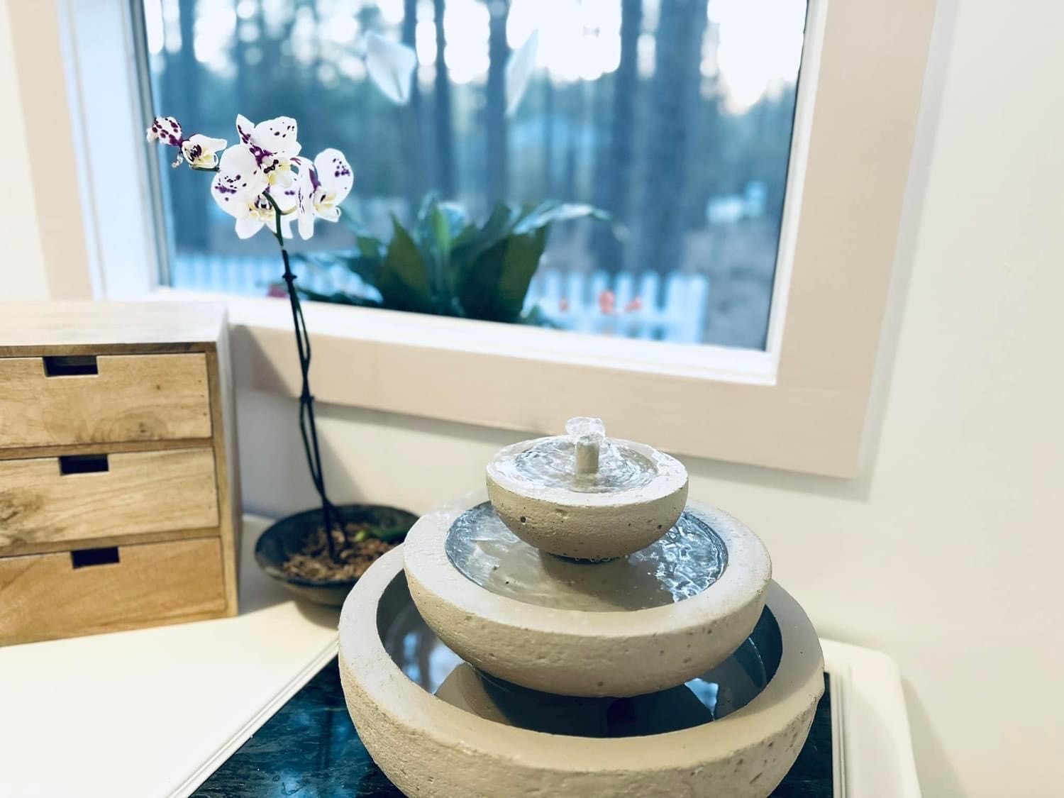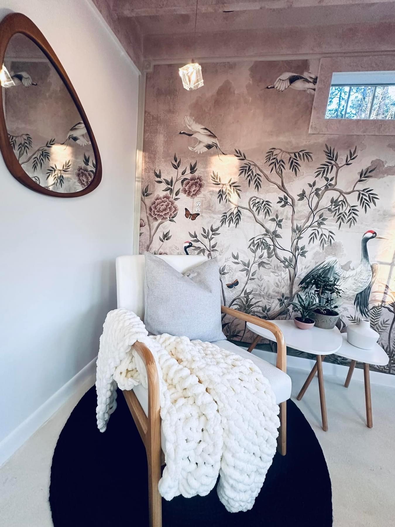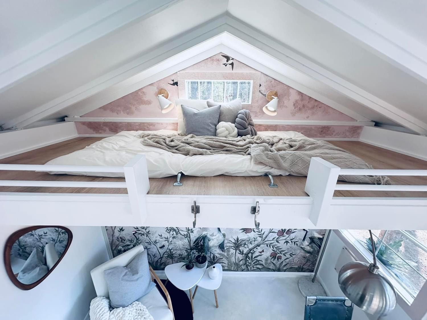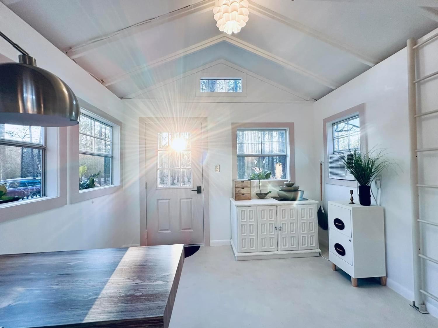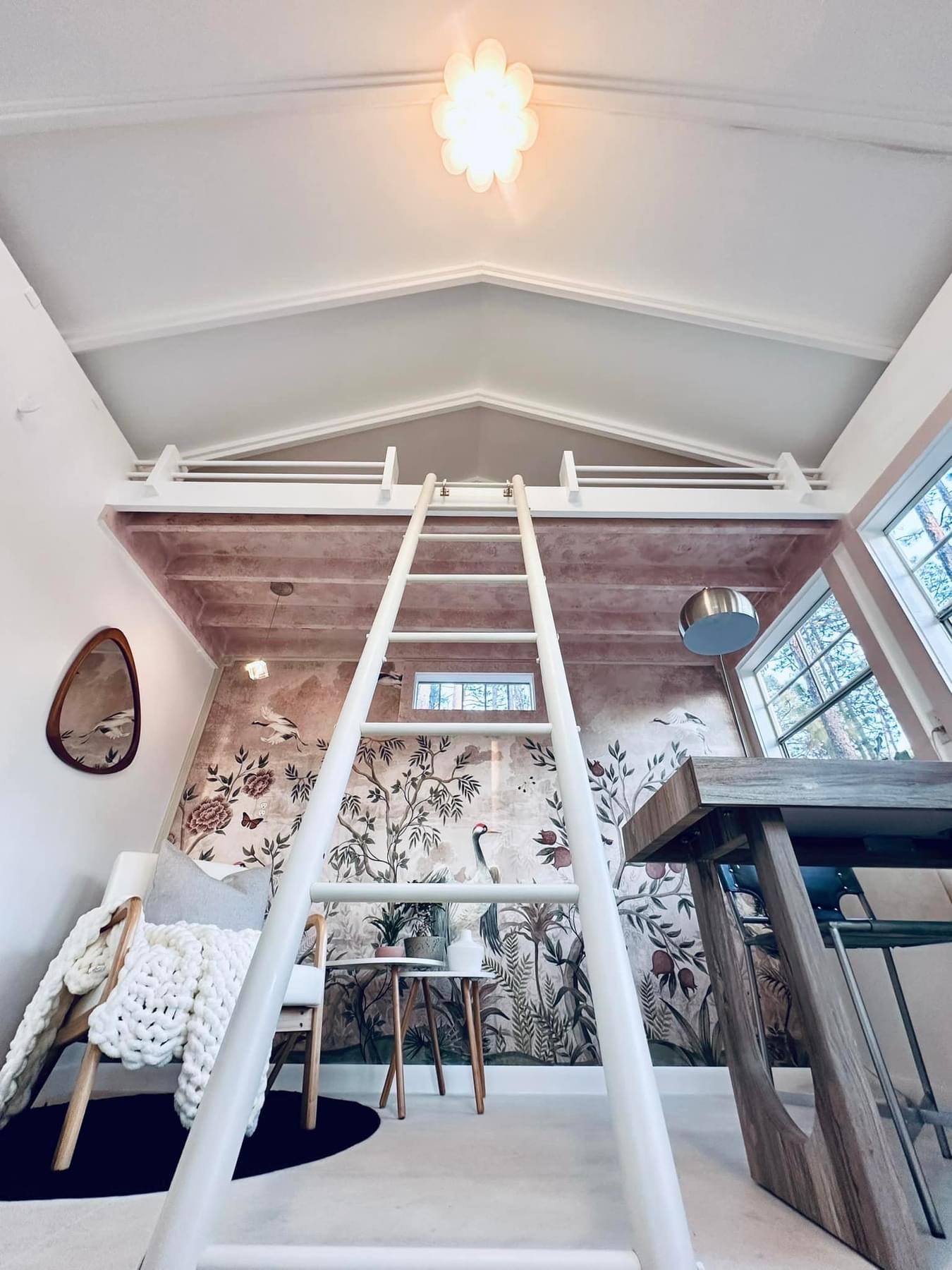 I designed my 12×12 shed with many windows so I could work in natural light. My first task was to wire for electricity, then add insulation and drywall. Next, I hung a Japanese mural that would be the centerpiece for my Japandi-style interior. This feature, coupled with the intentional high loft, minimal furniture, and neutral tones, opened up the space to make it look and feel much larger than it is. Last was the floor. Resin can be messy, so I opted to keep the floor as is and painted a lime wash over it, which created a beautiful finishing touch to the room.”